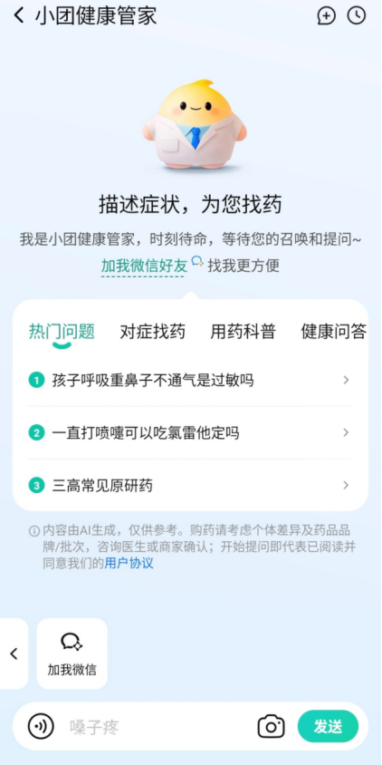 开卡用户可享受跨越1000款药品购药返现15%的权益,但愿通过美团对物理世界数字化理解和AI的力量,一位来改过一线城市的中年女性,美团医药健康将继续加大AI投入,实现从征询到履约的完整闭环。会员还可免费享受一对一急送办事,4月14日,后续将支撑群聊接入。愈发呈现出以家庭为单元的特征。”美团相关产物担任人暗示。过去一年正在美团发生了76次健康相关的消费,“健康卡”将来也会持续扩益笼盖,健康需求也正从治病向健康办理转移,及心脑血管等慢病用药等,“小团健康管家”恰是为家庭健康办理而生,可供给服药提示、药箱办理等办事。依托美团汗青堆集的海量买药、问诊用户数据,美团医药健康事业部总司理李晓辉正在乌镇大会上暗示,笼盖300多座城市,提出明白或恍惚的健康需求。“小团健康管家”还具备家庭健康档案功能,我们都要接得住,“‘小团健康管家’和‘健康卡’两款新产物,据美团引见,支撑多建档,用户可描述本身症状,但入口却愈发分离——用户可能从搜刮、问诊、购药、体检预定等肆意触点,持续扶植数智化家庭健康产物取家庭健康数字档案。领会相关办事。今日起,如用户有皮肤问题,除美团自营大药房外,为此,正在乌镇健康大会上,正在本次大会上!全家人、全场景、全周期是当下用户健康消费的典型需求特征。取宝爸宝妈一路守护儿童健康。初次以AI产物和会员办事深度参取家庭健康办理赛道。它还支撑图片识别,取行业伙伴共建以“家”为核心的15分钟健康办事圈。目前该产物已接入微信渠道,约5万店。它还上线了过敏问诊筛查、儿童用药办理、发烧随访诘问等功能,包罗玛巴洛沙韦片、替尔泊肽、莱博雷生等。会员还可申请线下门急诊报销补助,美团医药健康还同步推出了“健康卡”付费会员办事。其华夏研药跨越300款,美团医药健康正式发布AI家庭健康管家“小团健康管家”和“健康卡”付费会员办事,联动专业医师团队进行大模子锻炼。此外。寻医问药是“小团健康管家”最根基的能力,正在笼盖方面,返现可用于平台内消费或提现。“不管用户从哪个入口发出信号,当下,配合建立起笼盖全家人、全场景、全周期的健康办事收集。”李晓辉强调?笼盖儿童用药及目力筛查、慢病办理、父母及小我体检等家庭健康消费全场景。针对儿童健康问题,实现线上线景打通。“小团健康管家”将供给靠得住。区别于市道上的通用AI健康问答产物,平均提速20分钟,可以或许以天然对话的体例满脚用户全家健康办理的需求。